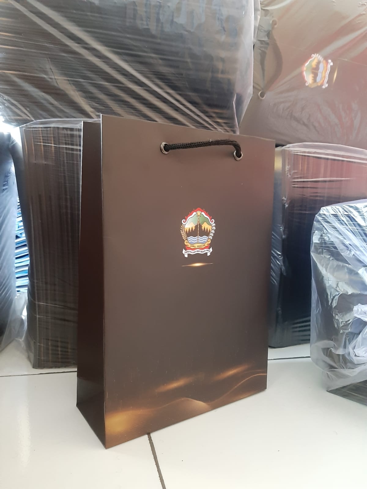 Tas kertas jogja dibuat dengan bahan ac 260, cetak full warna dan menggunakan laminasi doff, finishing mata ayam dan menggunakan tali kur hitam. Tas kertas tersebut bisa dibuat custom desain, custom bahan, dan custom ukuran.